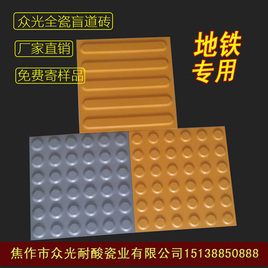 瓷質盲道磚制造商焦作市眾光耐酸瓷業有限公司,生產制造的瓷質盲道磚系列已被國家指定為地鐵高鐵站臺專用盲道磚鋪貼產品。眾光瓷業在短短幾年內已成為國內瓷質盲道磚生產制造及銷售商,為什么眾光瓷質盲道磚這么大受國內大小高鐵地鐵站臺的歡迎呢?原因不置可否,那就是出眾的品質,俗話說人有人品,磚也有磚品,此話一點都不假,眾光瓷質盲道磚就是憑借無可挑剔的品質來立穩腳跟、穩占市場。