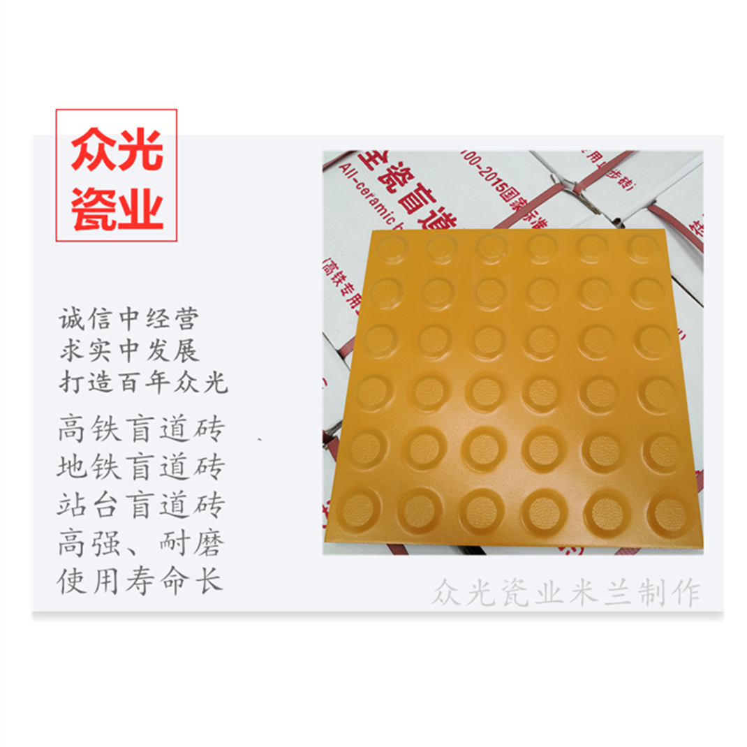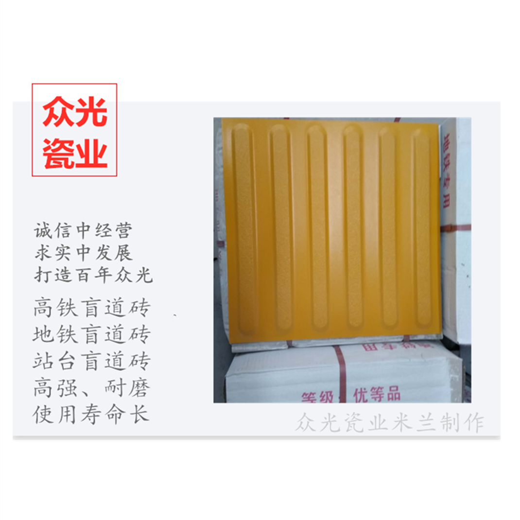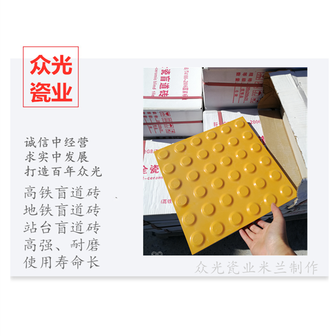 全瓷盲道磚生產廠家,焦作市眾光耐酸瓷業有限公司生產全瓷盲道磚,中黃盲道磚,耐磨,防滑,抗沖擊,色澤光鮮亮麗,適用于車站站臺
