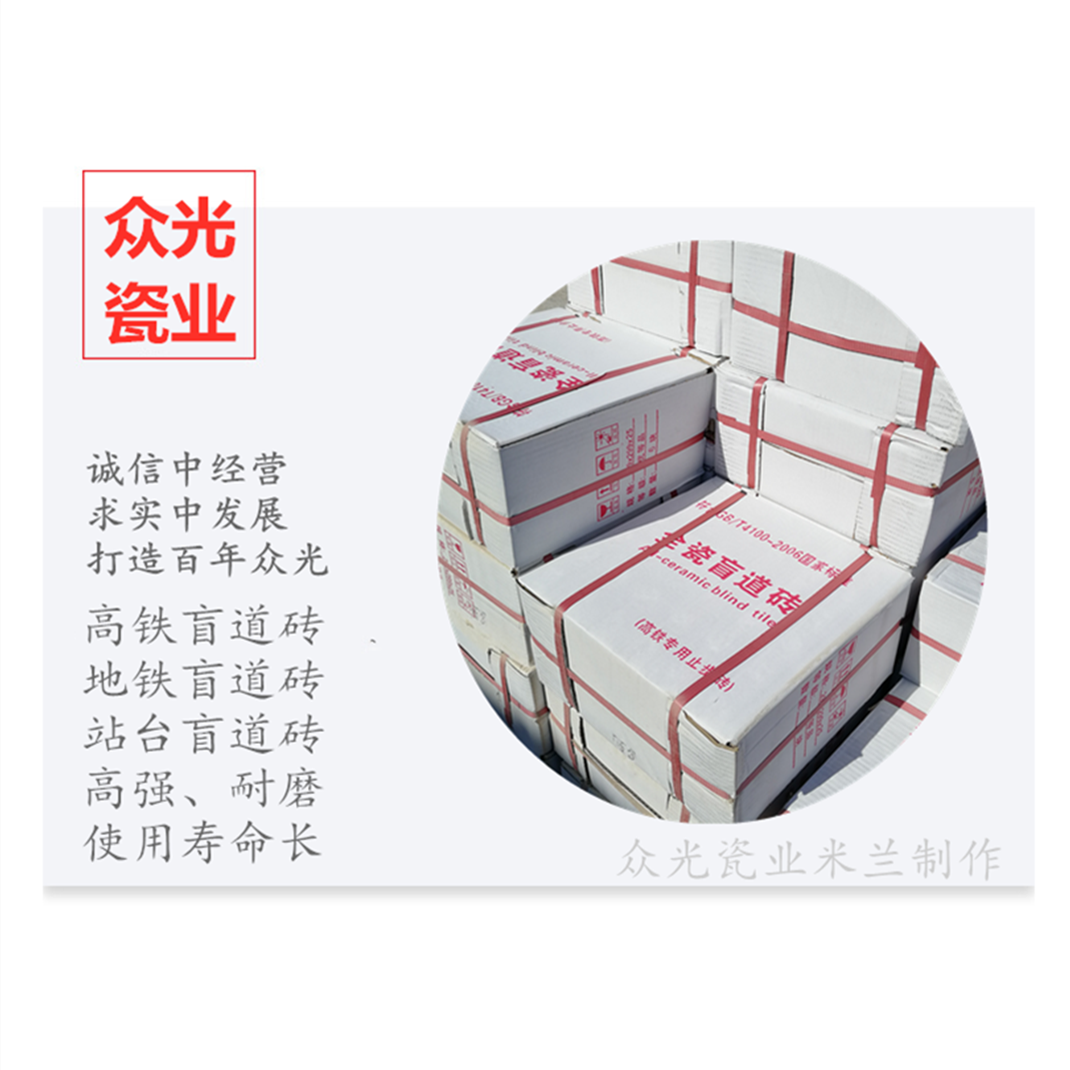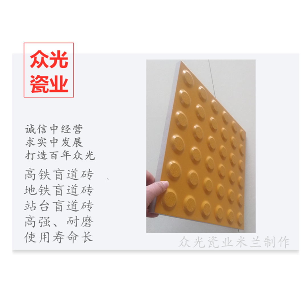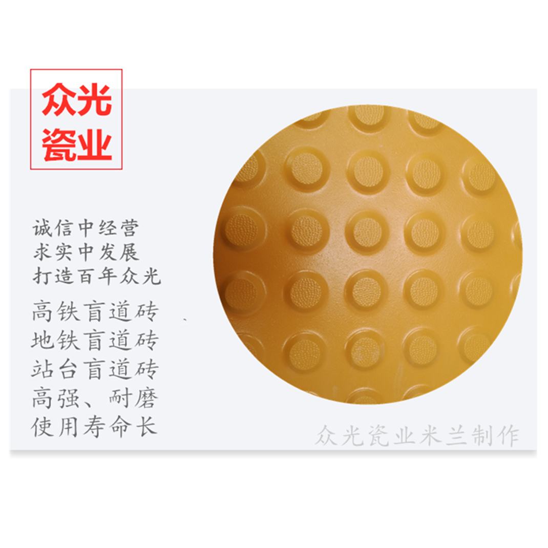 全瓷盲道磚生產廠家,焦作市眾光耐酸瓷業有限公司生產全瓷盲道磚,中黃盲道磚,耐磨,防滑,抗沖擊,色澤光鮮亮麗,適用于車站站臺